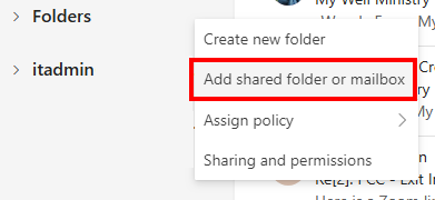 Click the 3 dots when you hover over your account name in the left sidebar and select “Add shared folder or mailbox”: