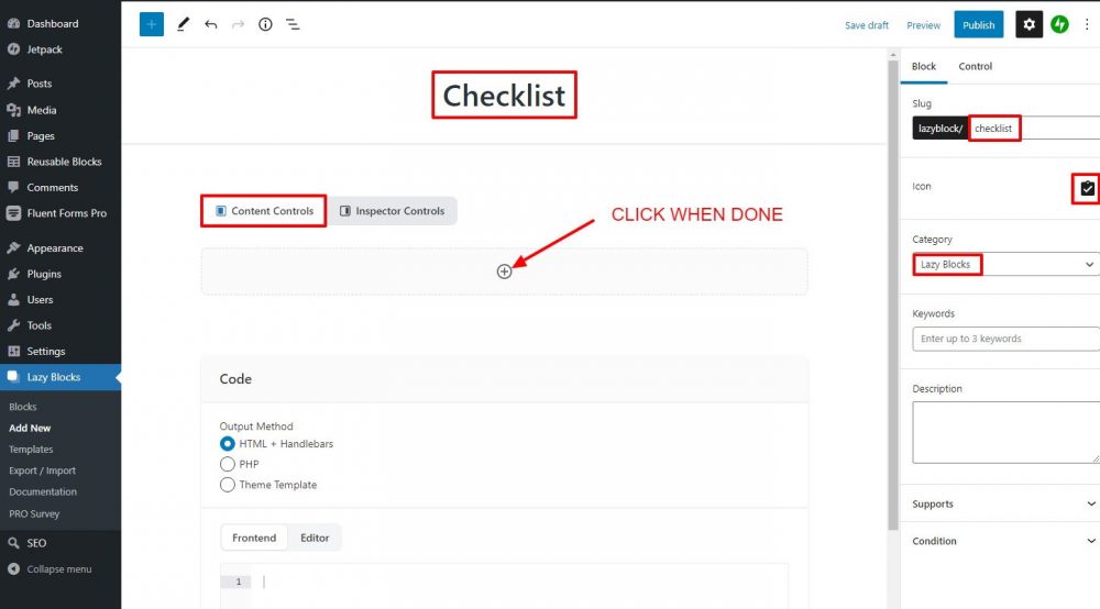 1. Enter “Checklist” for the Block Name at the top of the editor.